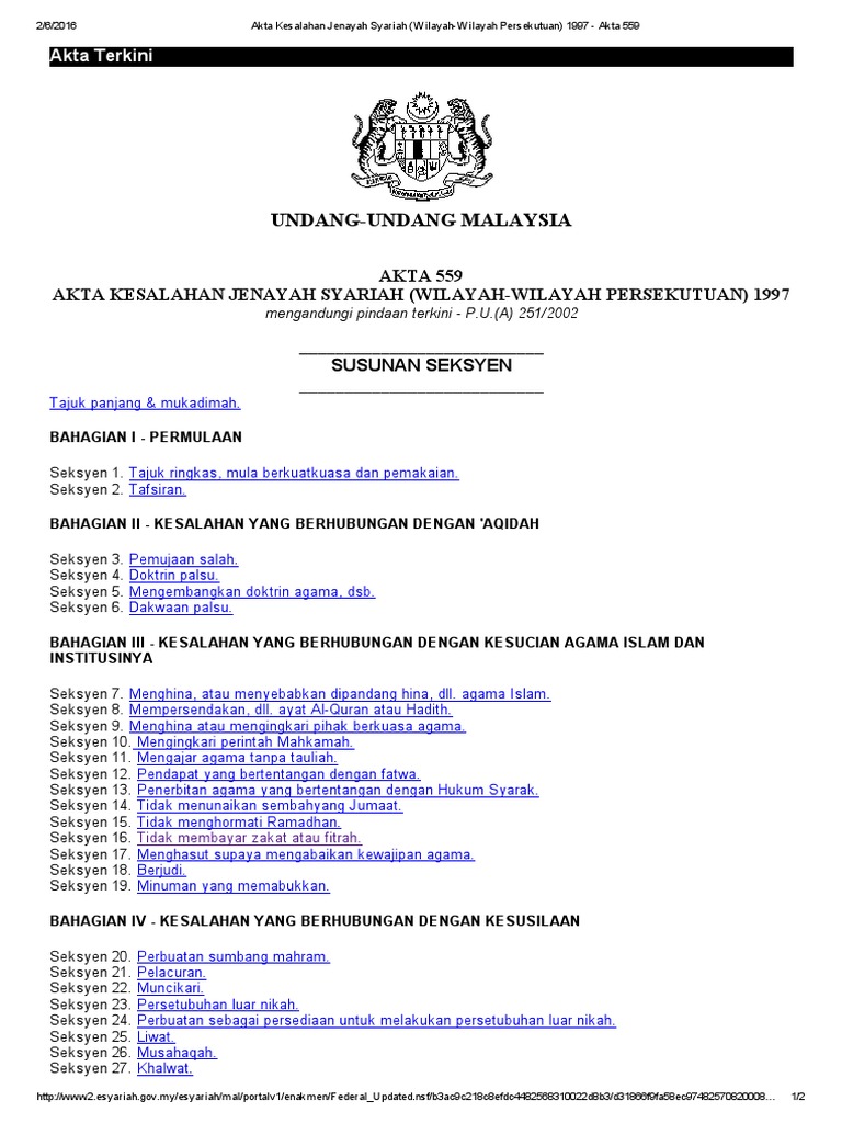 Akta tatacara mal mahkamah syariah wilayah wilayah persekutuan akta. Akta kesalahan jenayah syariah wilayah wilayah persekutuan 1997 pdf admin october 30 2020 leave a comment akta kesalahan jenayah syariah wilayah wilayah persekutuan akta by hasrul addin in types legal forms and akta kesalahan jenayah syariah. Syariah criminal offences enactment no. Wilayah persekutuan putrajaya 1 februari 2001 p u.