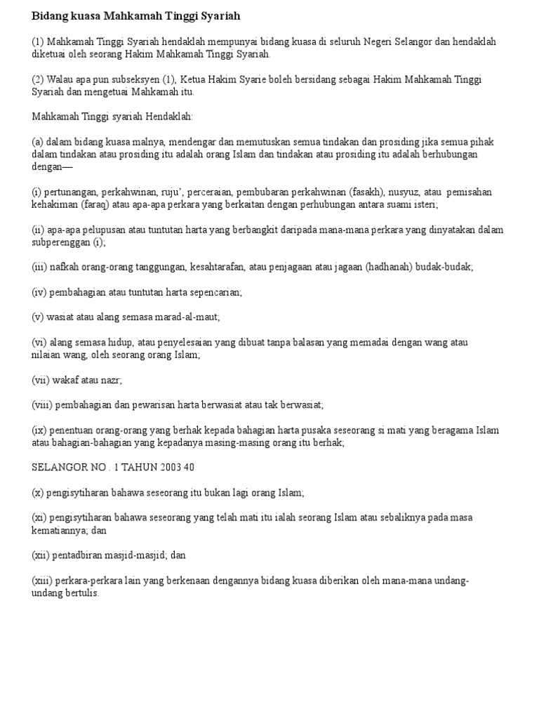 Bidang kuasa kes mal mahkamah tinggi syariah selangor meliputi nilaian tuntutan melebihi rm300 000 00. Mahkamah tinggi syariah selangor darul ehsan jabatan kehakiman syariah negeri selangor bangunan mahkamah syariah sultan idris shah persiaran masjid seksyen 5 40000 shah alam selangor. Bidang kuasa mahkamah syariah adalah sebagaimana yang diperuntukkan oleh perlembagaan malaysia. Isu awalan berhubung bidang kuasa mahkamah tinggi syariah melaka yang telah membicarakan kes harta sepencarian ini sedangkan perceraian berlaku di muar johor.