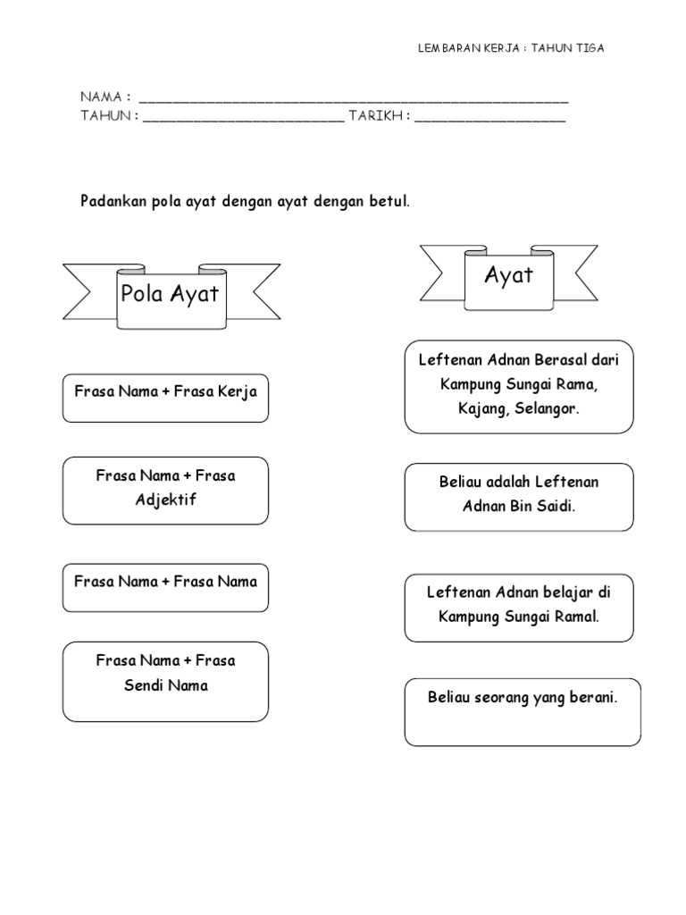 Bina ayat lembaran kerja bahasa melayu tahun 3. Rakan rakan guru boleh juga gunakan bahan ini mengikut kesesuaian isi pelajaran yang ingin disampaikan. Tidak hanya terhad untuk pembelajaran bahasa melayu namun guru guru. Tulis lima ayat yang lengkap tentang aktiviti yang. Lembaran kerja bahasa melayu tahun 1 2 dan 3 saya kongsikan kali ini lebih kepada rumusan aktiviti pengayaan yang saya laksanakan di dalam kelas pada minggu lalu.