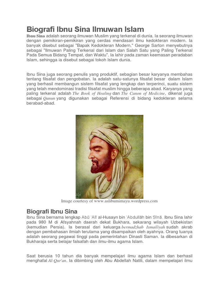 Biografi tokoh islam ibnu sina. Nama penuh beliau adalah abu ali al husayn ibn abd allah ibn sina. Ia seorang ilmuwan dengan pemikiran pemikiran yang cerdas mendasari ilmu kedokteran modern. Ia banyak disebut sebagai bapak kedokteran modern george sarton menyebutnya sebagai ilmuwan paling terkenal dari islam dan salah satu yang paling terkenal pada semua bidang tempat dan waktu. Ibnu sina menulis secara ekstensif pada filsafat islam awal terutama mata pelajaran logika etika dan metafisika termasuk risalah bernama logika dan metafisika.