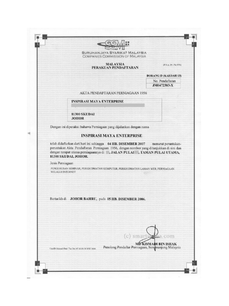 Kelulusan nama perniagaan tidak perlu dipohon sekiranya nama sendiri digunakan seperti yang tertera di dalam kad pengenalan. 002678814 t telah didaftarkan dari hari ini sehingga 17 julai 2018 di bawah akta pendaftaran perniagaan 1956 beralamat di. Pejabat pendaftaran perniagaan borang a d atau b orang 9 13 24 49 daripada suruhanjaya syarikat malaysia s sm serta mengisi borang permohonan pendaftaran fail majikan iaitu kl r 368a. Borang d kaedah 13 perakuan pendaftaran akta pendaftaran perniagaan 1956 dengan ini diperakui bahawa perniagaan yang dijalankan dengan nama nora elina enterprise no.