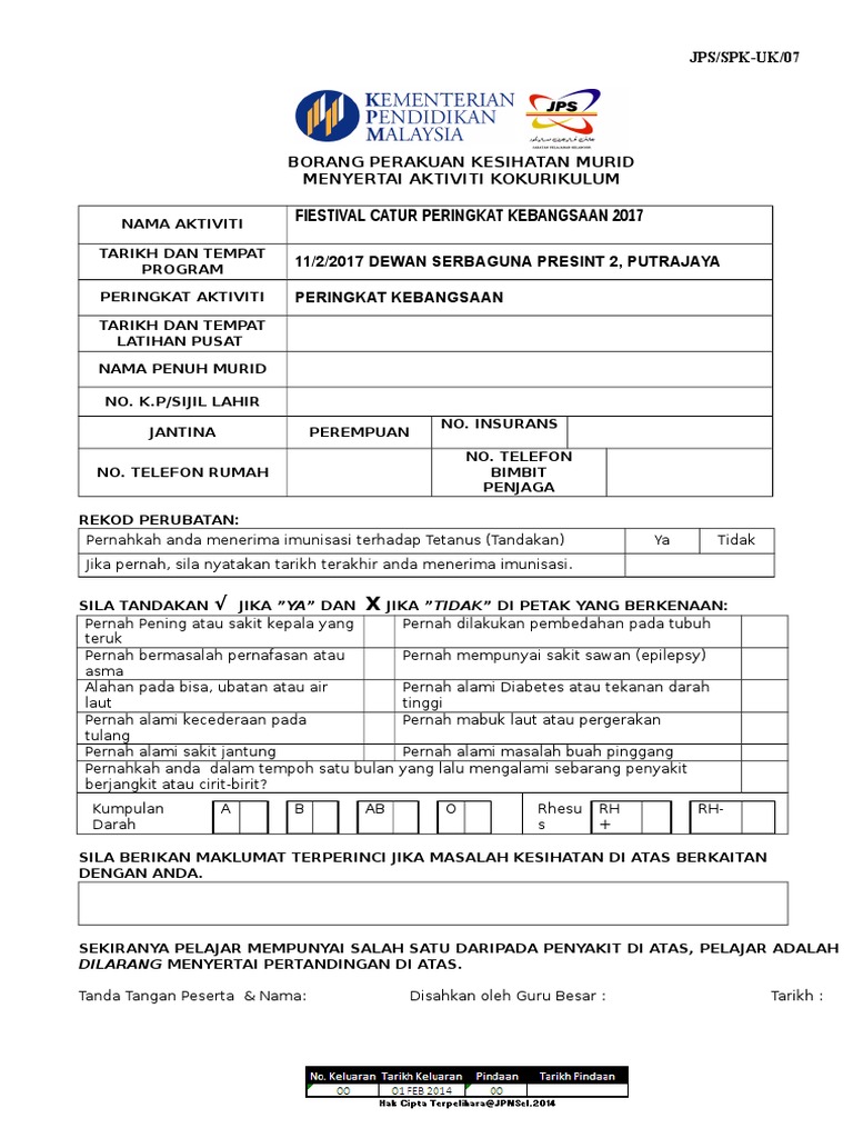 K p sijil lahir jantina no. Sistem ini diwujudkan bagi memudahkan proses kemasukan prestasi kokurikulum murid oleh guru guru yang merangkumi aktiviti jasmani sukan dan kokurikulum. Sila berikan maklumat terperinci jika masalah kesihatan di atas berkaitan. Berikut merupakan contoh borang deklarasi murid untuk aktiviti luar.