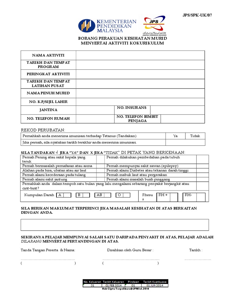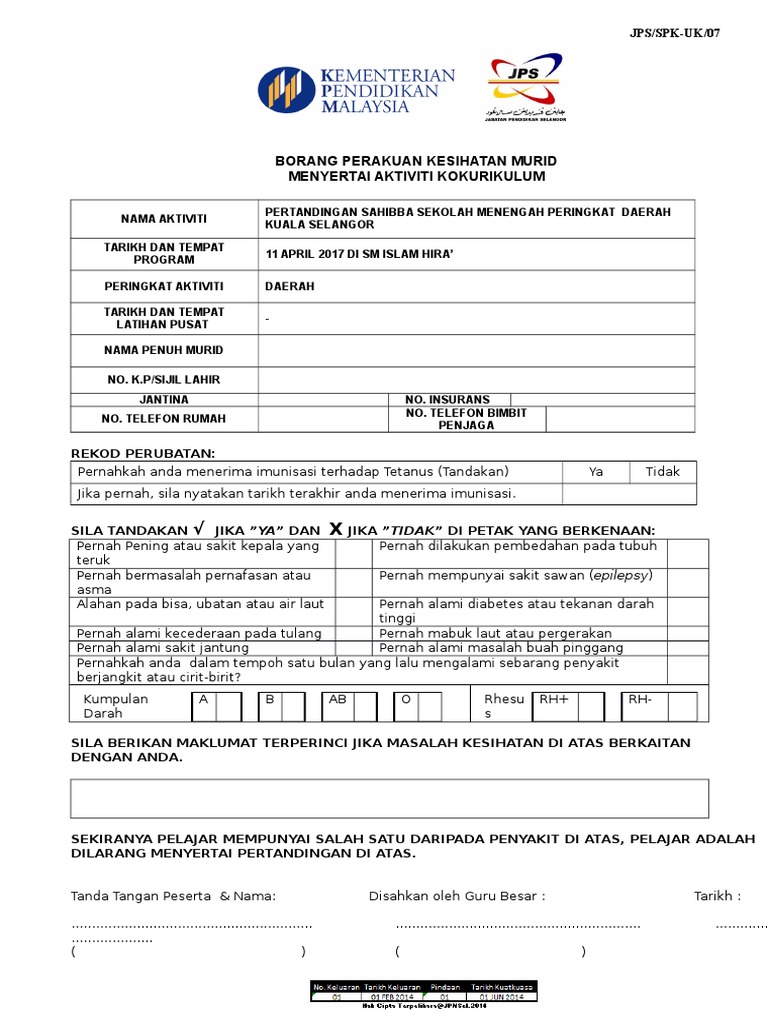 Borang perakuan kesihatan murid menyertai aktiviti kokurikulum. Borang perakuan kesihatan murid sebelum menyertai aktiviti kokurikulum kurikulum kelolaan jpn ppd sekolah borang ini akan digunakan semasa membawa pelajar mendapat rawatan di klinik atau hospital. Pegawai urusetia yang telah diamanahkan. Telefon tangan penjaga rekod perubatan. Kesimpulannya kerjasama dapat dipupuk melalui aktiviti kokurikulum.