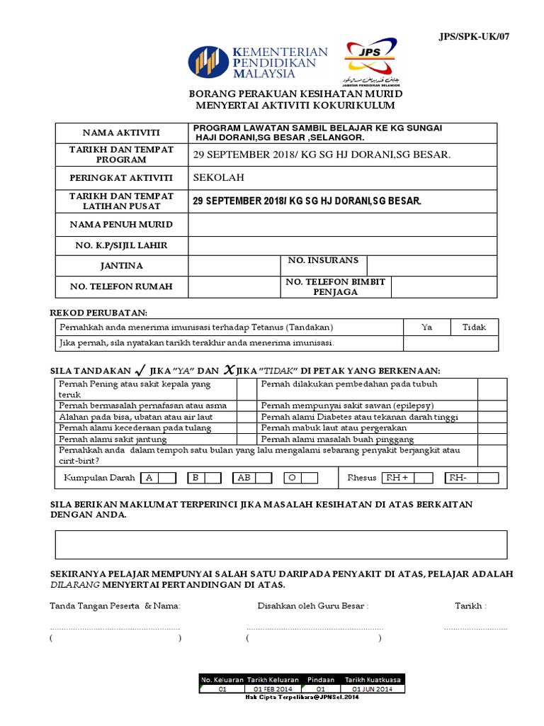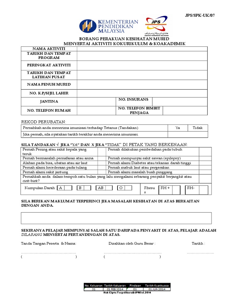 Perakuan pegawai kesihatan berhubungan dengan pemeriksaan ke atas pelajar sila tandakan jika ada masalah kesihatan dan tandakan x. K p sijil lahir jantina no. Borang perakuan kesihatan murid menyertai aktiviti kokurikulum nama aktiviti karnival sains dan teknologi peringkat daerah hulu selangor 2015 tarikh dan tempat program 4 ogos 2015 di smk kalumpang hulu selangor peringkat aktiviti daerah hulu selangor tarikh dan tempat latihan pusat nama penuh murid no. Ya tidak 6.