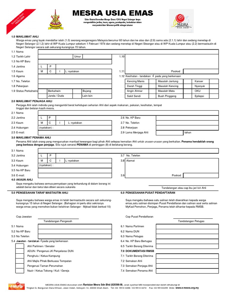 Dokumen dokumen berikut perlu disertakan bersama sama dengan borang permohonan ini. Kesihatan tandakan pada yang berkenaan kencing manis saya mengaku bahawa semua pernyataan yang terkandung di dalam borang ini adalah benar dan betul dan diberi secara sukarela. Skim mesra usia emas borang permohonan jom shopping warga emas oku negeri selangor. Skim ini dilancarkan pada bulan ogos 2008 dan secara rasmi mula beroperasi pada 1 oktober 2008.