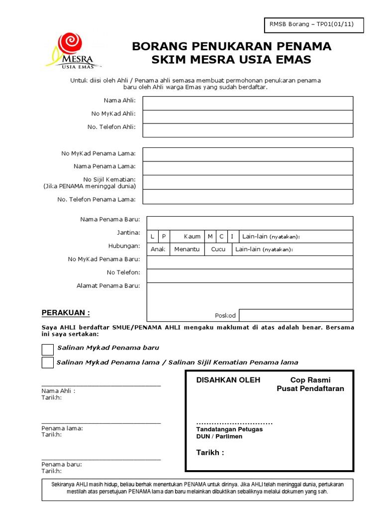 Borang permohonan skim mesra usia emas pdf. Mesra usia emas diuruskan oleh rantaian mesra sdn bhd 820398 m anak syarikat mb incorporated dan boleh dihubungi di tingkat g bangunan darul ehsan jalan indah seksyen 14 40000 shah alam. Jika penama meninggal dunia no. Di samping itu usia ini juga mencetuskan beberapa cabaran bagi golongan warga emas dalam menghadapi masalah yang melibatkan mental fizikal sosial dan kewangan. Tertakluk pada syarat syarat kelayakan permohonan smue.