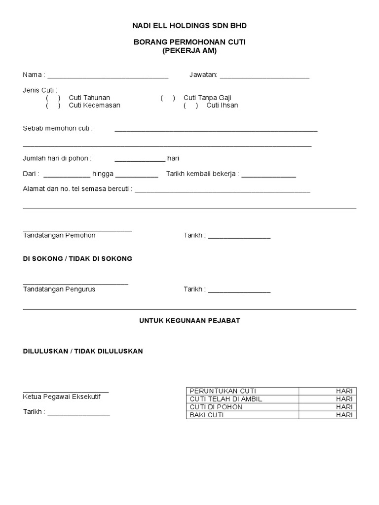 Contoh borang cuti tahunan pekerja. Rujuk pula pada seksyen 60 e 3 a akta kerja 1955 yang berbunyi. Contoh surat cuti tahunan cuti tahunan termasuk jenis hak cuti karyawan yang sering diminta oleh karyawan. Namun jika terdapat kesalahan atau kekeliruan penulisan serta format contoh surat permintaan cuti di atas kami memohon kritik dan saran serta masukan positif dari anda agar menjadi sempurnanya surat permohonan. Dengan ini mengajukan cuti.