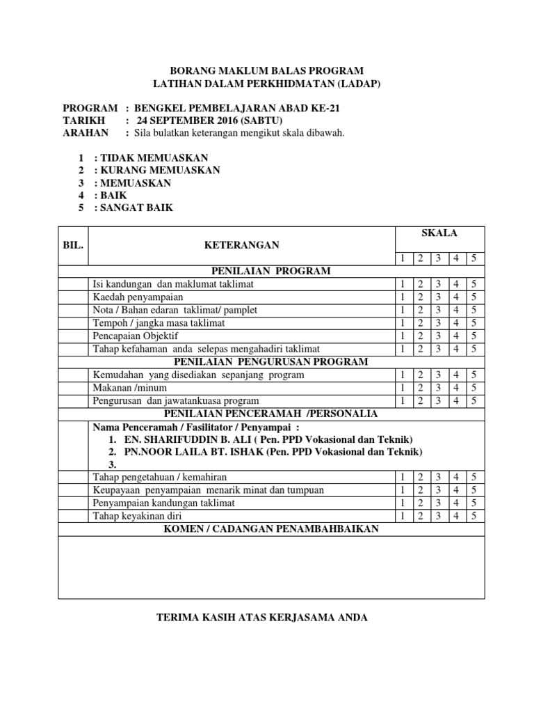 Contoh borang maklum balas program motivasi. Pelanggan datang sendiri surat borang dari peti cadangan melalui telefon mel elektronik dialog perjumpaan tertentu media cetak lain lain. Kemudahan dan perjalanan program. Sebanyak dua puluh empat 24 borang dapat dihantar ke ptj untuk tindakan manakala satu 1 borang tidak dapat dihantar kerana kekurangan maklumat yang diisi oleh pengadu. Borang maklum balas dialog prestasi.
