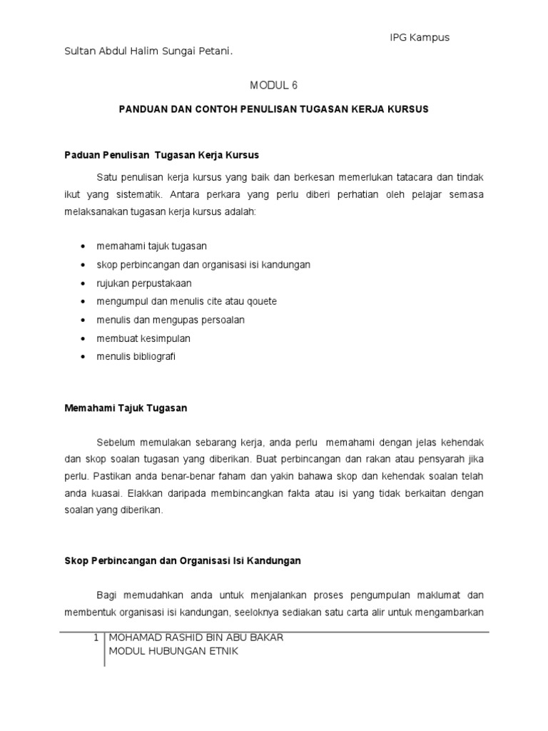 Contoh pembuatan assignment ctu101 asas asas dalam islam tajuk pergaulan dalam islam kelas nama ahli kumpulan pengenalan huraian 4x4 2 16 kesimpulan. Matrik br mohammad hafizi bin ghazali br a 128000 br kod dan nama kursus br zzzt 2243 kemahiran penulisan br sesi pengajian br semester 3 br tajuk kajian br masalah pembuangan bayi dalam kalangan remaja di malaysia br nama pensyarah br puan rozmel binti abdul latiff br isi kandungan br isi kandungan muka surat. 10 2 3 penghargaan penghargaan biasanya mengandung kata kata penghargaan atas tunjuk ajar dan bantuan daripada individu dan institusi tidak dikira sebagai muka surat tetapi dinomborkan dengan huruf roman10 2 4 senarai kandungan senarai isi kandungan hendaklah disusun mengikut urutan yang berpadanan dengan nombor muka surat yang mengandung semua topik dan subtopik tidak dikira sebagai muka.
