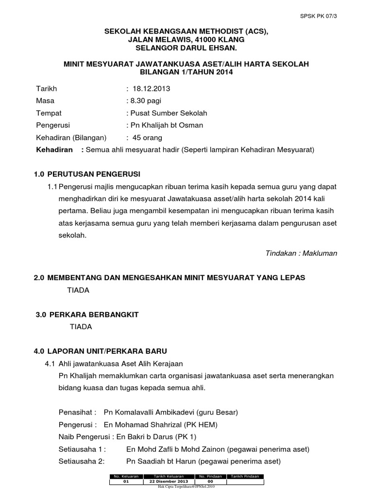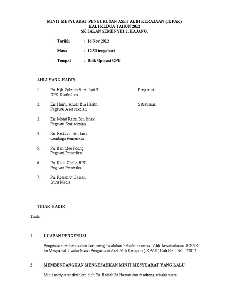 Contoh minit mesyuarat aset alih kerajaan sekolah. 8 ke perluan peralatan mesyuarat 1 8 1 mengambil makluman keperluan peralatan semasa pertandingan rujuk lampiran 2 perkara 8 0. Jawatankuasa pengurusan aset alih kerajaan dan selenggaraan. Minit mesyuarat aset sekolah kali ke 2 bil 2 2012 there is document minit mesyuarat aset sekolah kali ke 2 bil 2 2012 available here for reading and downloading. 1 2 memaklumkan bahawa tujuan mesyuarat ini diadakan adalah untuk menerangkan tentang dasar pengurusan aset kerajaan dan perlantikan ahli jawatankuasa pengurusan aset alih kerajaan peringkat sekolah bagi tahun 2015.