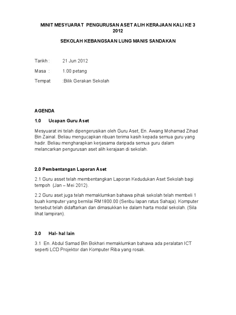 Contoh Minit Mesyuarat Aset Alih Kerajaan Sekolah