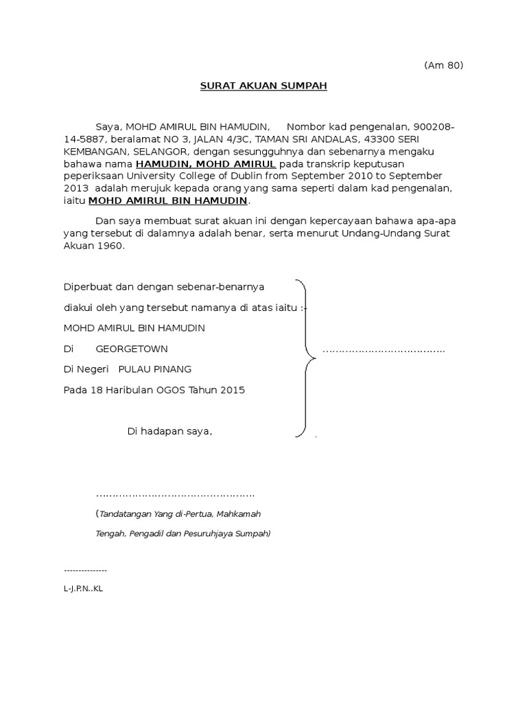 Contoh surat akuan bersumpah. Tukar majikan surat akuan bersumpah dan pelepasan penerimaan sample. Perlantikan semula atau perlantikan pemegang amanah baharu. Diperbuat dan dengan sesungguhnya diakui oleh. Dan saya membuat akuan ini dengan kepercayaan bahawa apa apa yang tersebut di dalam perakuan ini adalah benar serta menurut akta akuan berkanun 1960.