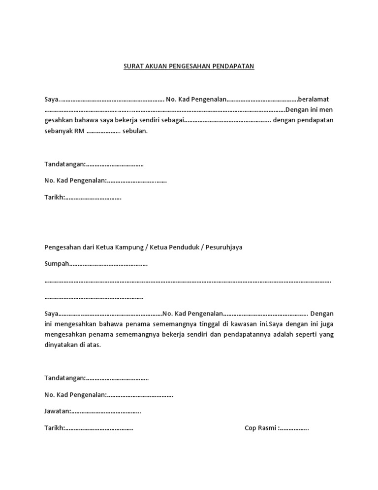 Contoh borang pengesahan akuan pendapatan. Akuan pengesahan pendapatan source. Related posts to contoh surat rasmi pengesahan pendapatan bekerja sendiri. Save save surat akuan pengesahan pendapatan bekerja sendiri for later.