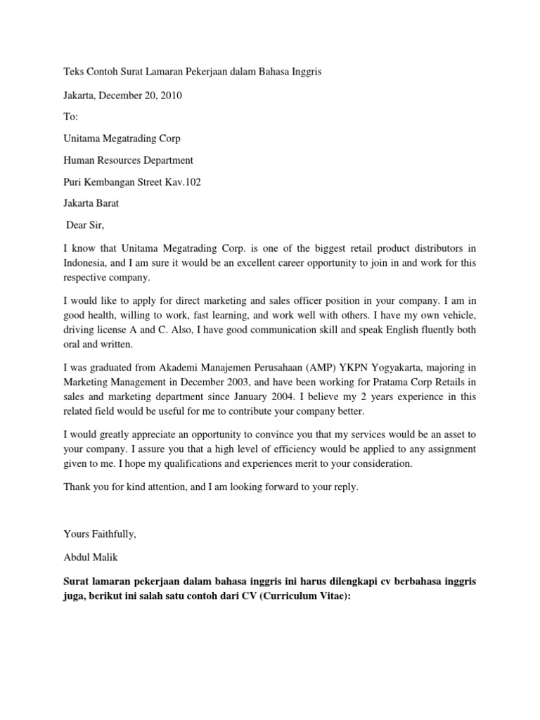Contoh surat lamaran kerja marketing dalam bahasa inggris dan artinya. Contoh surat lamaran kerja dalam bahasa inggris beserta artinya terbaru apakah sahabat sbi ingin membuat surat permohonan lamaran kerja. 10 contoh surat lamaran kerja dalam bahasa inggris beserta artinya terbaru apakah teman teman kbi sedang mencari contoh surat lamaran kerja dalam bahasa inggris kebetulan sekali ini admin akan membagikan contoh lamaran kerja dalam bahasa inggris. Dear plankton based on the advertisement in suara jawa tengah at january 29th 2019 there a job vacancy in your company as accountant. Surat lamaran pekerjaan dalam bahasa inggris dan artinya surat lamaran kerja untuk digital circuit design and programming language dalam bahasa inggris nah bagi anda yang membutuhkan surat lamaran pekerjaan bahasa inggris ini silahkna download melalui link dibawah ini file tesebut dalam bentuk doc yang berisi banyak surat lamaran bahasa inggrisnya.