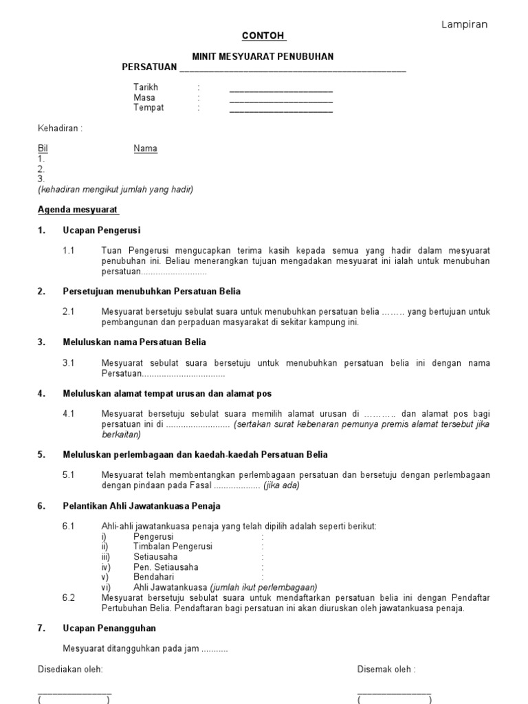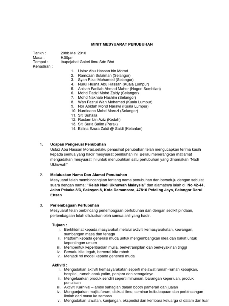 Minit mesyuarat penubuhan. Berikut disertakan cara buat dan contoh minit mesyuarat yang berkualiti lengkap dan mudah beserta maklumat format dan contoh. Minit mesyuarat atau minutes of meeting mom adalah penting dalam sesebuah mesyuarat kerana ia akan menjadi panduan dan rujukan buat pekerja dan orang yang hadir atau tidak untuk mengetahui hasil keputusan sesuatu mesyuarat. Academia edu is a platform for academics to share research papers.