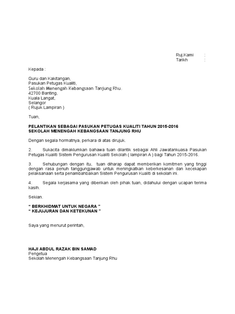 Contoh surat kelulusan permohonan penubuhan unit u. Dengan pelantikan tersebut adalah sangat sangat diharapkan agar tuan puan dapat. Surat perlantikan ini tidak kiralah untuk jawatan apa sekalipun seperti jawatankuasa keselamatan dan kesihatan atau apa sahaja. 3 5 jpka ditubuhkan.