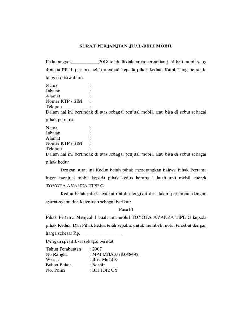 Surat perjanjian jual beli mobil termasuk ke dalam surat resmi yang sebenarnya sama dengan 4 surat perjanjian kontrak rumah dan sewa yang paling baru dan juga contoh surat perjanjian kontrak kerja yang baik dan format penulisan yang benar karena semuanya berisi tentang pernyataan bahwa telah sepakat untuk berjanji dalam hal ini kedua pihak sepakat telah menjual dan membeli mobil. Surat jual beli mobil berikut ini anda bisa lansung copypaste surat perjanjian jual beli mobil ini untuk kelengkapan administrasi anda contohsurat id jual beli dapat diartikan sebagai proses tukar menukar atau menukar barang yang satu dengan barang yang lain. Surat jual beli mobil bekas tidak jarang bagi konsumen untuk membuat kesalahan dengan menandatangani kontrak tanpa membacanya terlebih dahulu. Surat jual beli mobil ketika anda membeli hp bekas dari orang lain maka tidak ada keharusan untuk melakukan perjanjian hitam diatas putih.