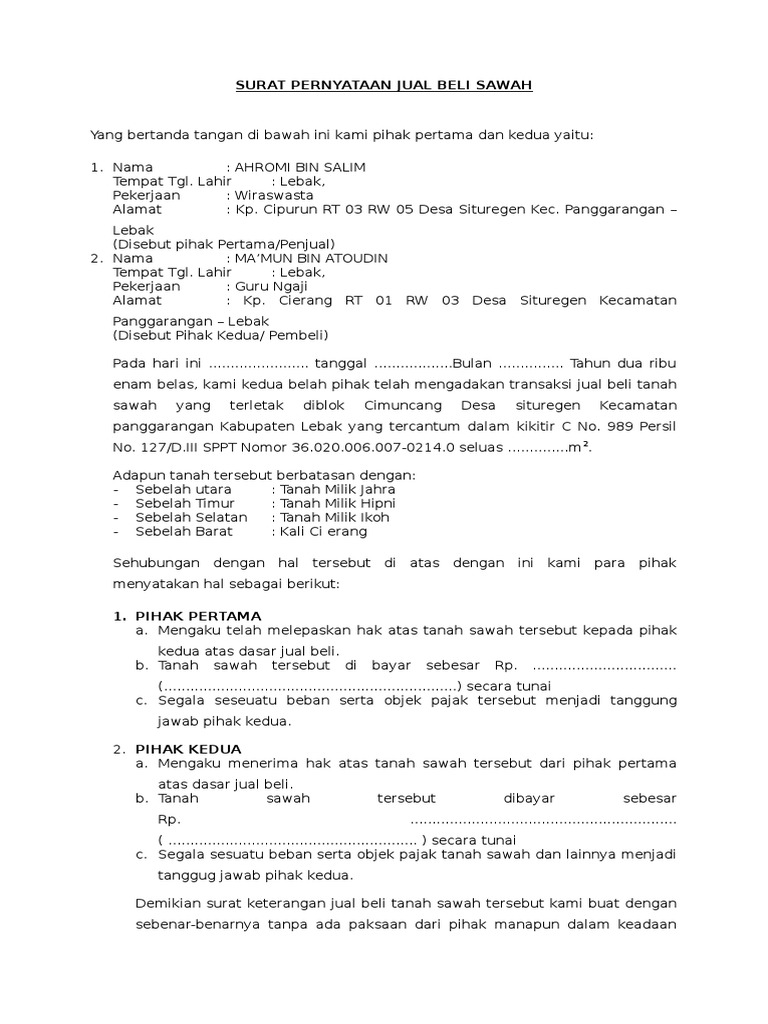 Contoh Surat Perjanjian Jual Beli Tanah Sawah Doc