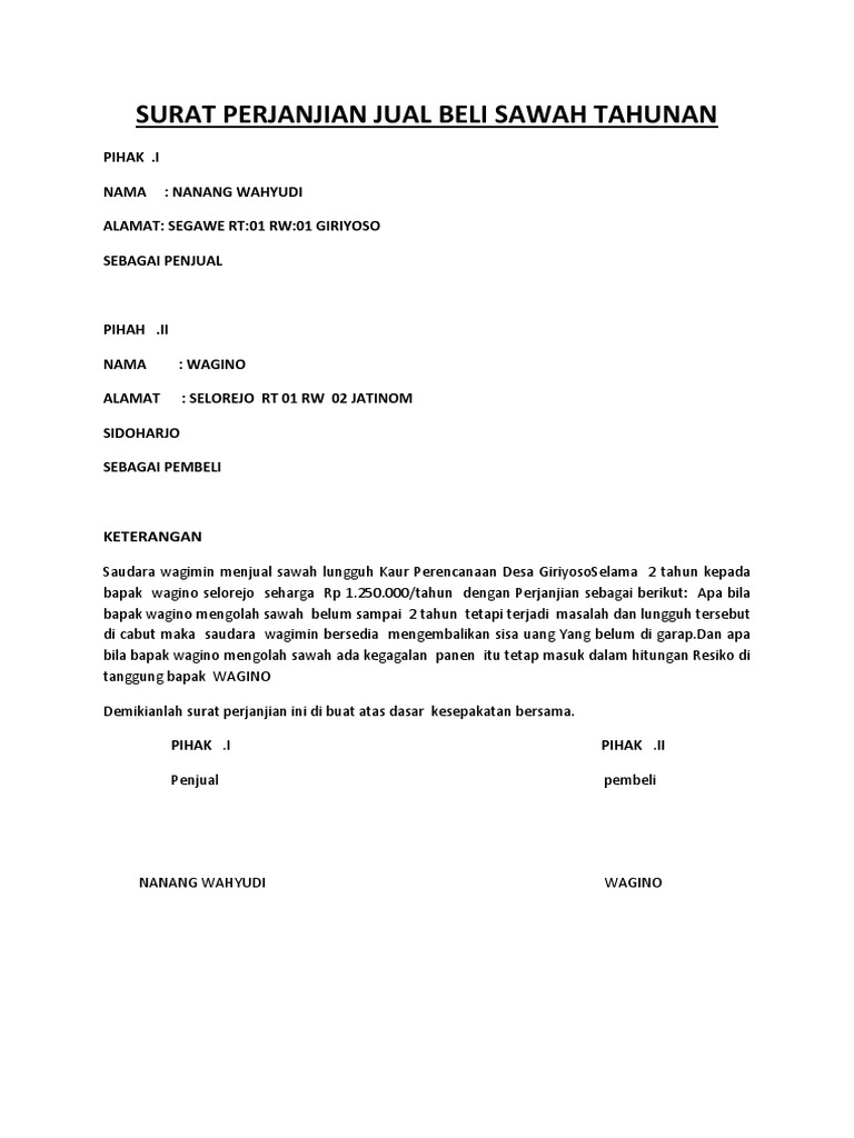 Contoh surat perjanjian jual beli tanah sawah. Contoh surat jual beli tanah di atas biasanya umum digunakan oleh sejumlah pihak. Adapun contoh surat jual beli tanah sawah tersebut dapat dilihat di bawah ini. Surat perjanjian jual beli tanah sawah. Contoh surat jual beli tanah sawah contoh surat perjanjian jual beli sawah.