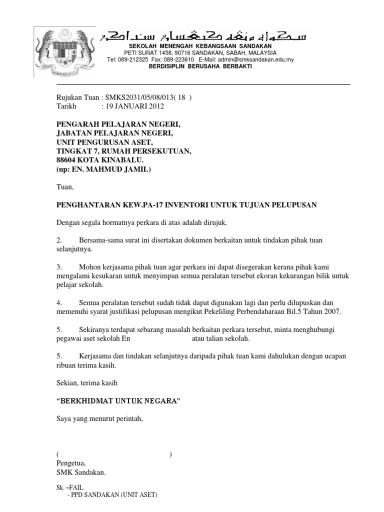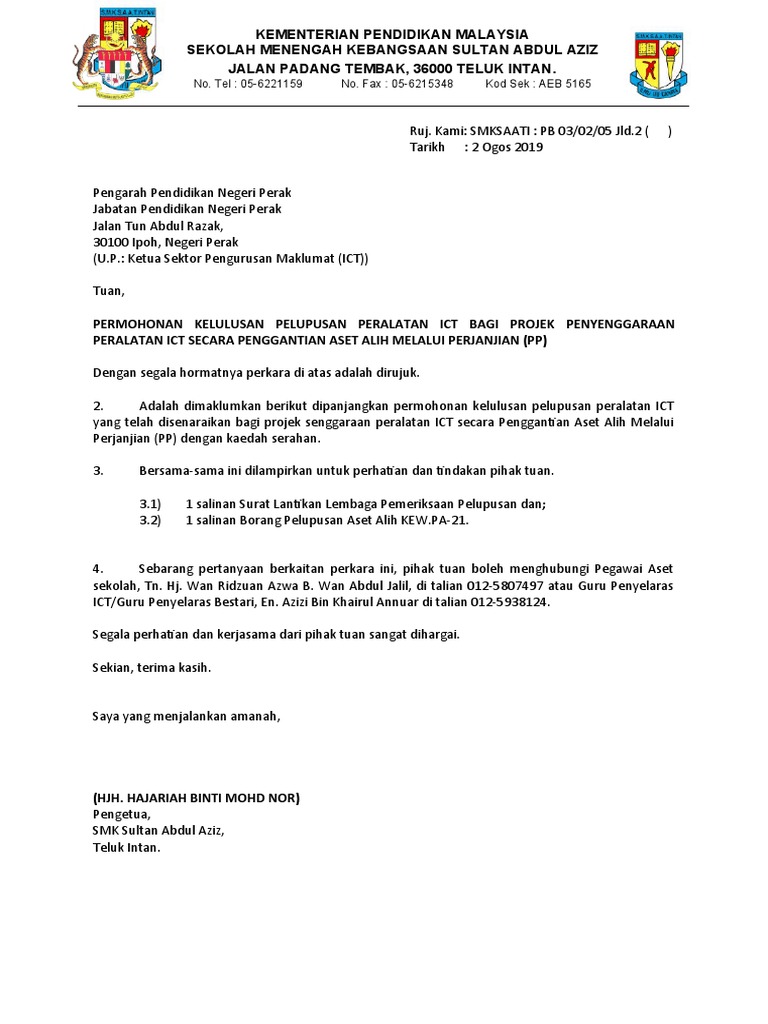 Contoh surat permohonan pelupusan aset. Jenis aset alih 1 aset kementerian jabatan yang di perolehi daripada wang kerajaan 2 aset yang di terima sebagai hadiah atau sumbangan 3 sampel barang contoh untuk tender kontrak 4 aset yang di lucut hak justifikasi pelupusan 1 barang pecah dan rosak 2 habis tempoh penggunaan ekonomik 3 tidak ekonomik di baiki 4 usang 5 tamat tarikh luput. Jabatan pelajaran negeri unit pengurusan aset tingkat 7 rumah persekutuan 88604 kota kinabalu. Pengenalan setiap kali kita ingin menulis surat rasmi pasti kita akan berfikir untuk mencari ayat yang sesuai bagi menyampaikan maksud atau tujuan kita dan dalam masa yang sama tidak menyingung perasaan mana mana pihak sebenarnya surat rasmi terbahagi kepada tiga bahagian utama iaitu permulaan pertengahan dan penutup surat. Kelulusan meroboh dari kptg dan perbendaharaan 6.
