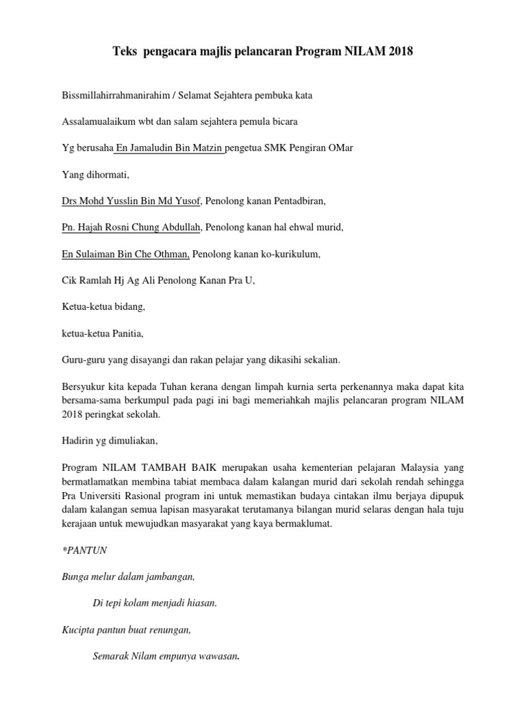Contoh teks ucapan perasmian nilam. Share teks pengacara majlis pelancaran program nilam 2018. Dari tingkatan kelas untuk menerima buku. Assalamualaikum w b t dan salam sejahtera salam 1malaysia. We are always happy to assist you.