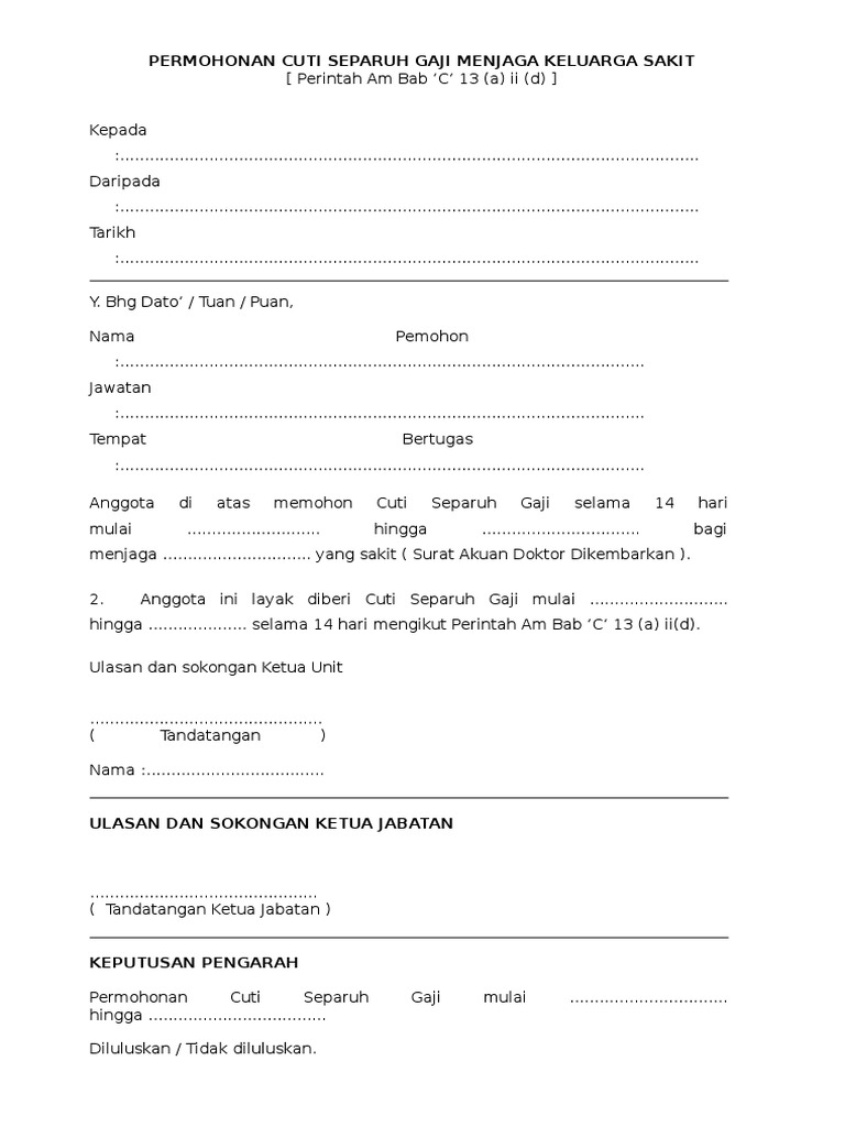 Tidak menjejaskan kelayakan pegawai bagi kemudahan cuti separuh gaji di bawah peruntukan perintah am 13 dan perintah am 51 bab c. Dibayar separuh daripada bayaran emolumen biasa bagi hari hari cuti tersebut. Contoh surat cuti menjaga anak surat rasmi memohon cuti sekolah ini penting untuk memastikan rekod berhenti sekolah kelak pelajar yang baik dan tiada mempunyai rekod kesalahan. Disemak oleh urus setia cuti.