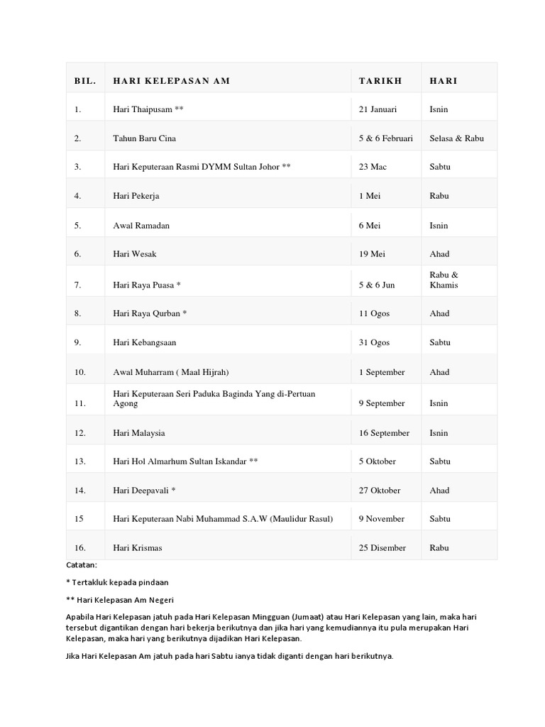 Cuti umum johor 2019 cuti kelepasan am dan cuti persekolahan bagi johor untuk tahun 2019. Cuti umum 2019 negeri johor. Tarikh berikut mungkin diubah suai. Hari kelepasan am negeri johor 2019 adalah dengan ini dimaklumkan untuk pengetahuan umum bahawa hari hari yang berikut adalah diisytiharkan sebagai hari kelepasan am negeri johor bagi tahun 2019.