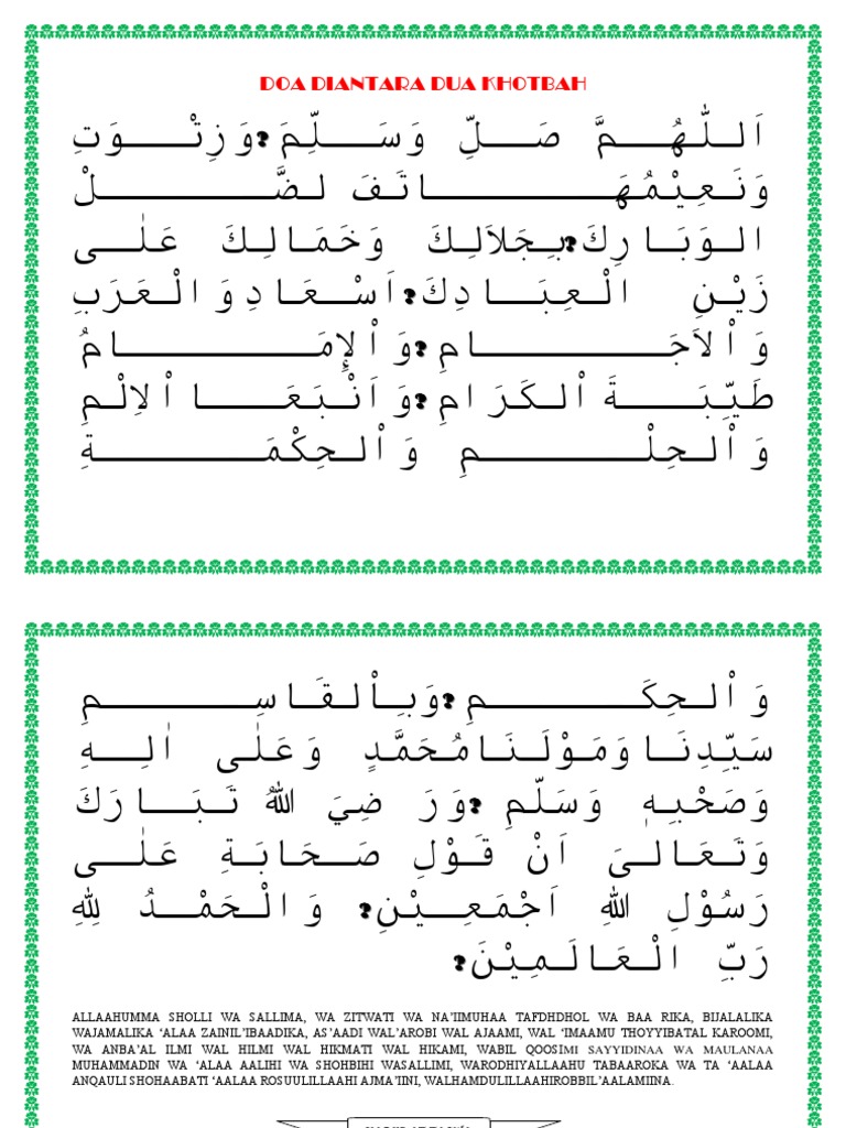 Doa antara dua khutbah dan doa akhir khutbah dengan izin allah swt pada entri kali ini saya ingin berkongsi kepada pembaca sekalian tentang beberapa perkara yang mungkin menjadi kekeliruan di kalangan masyarakat iaitu berkenaan hukum menadah tangan membaca doa ketika antara dua khutbah dan juga ketika khatib membacakan doa di akhir khutbah. Namun mungkin sebagian orang yang melakukannya tidak mengetahui. Membaca ayat suci al quran pada salah satu di antara dua khutbah. Bacaan berikut ini merupakan bacaan yang biasa dibaca di pondok pesantren suryalaya tasikmalaya jawa barat.