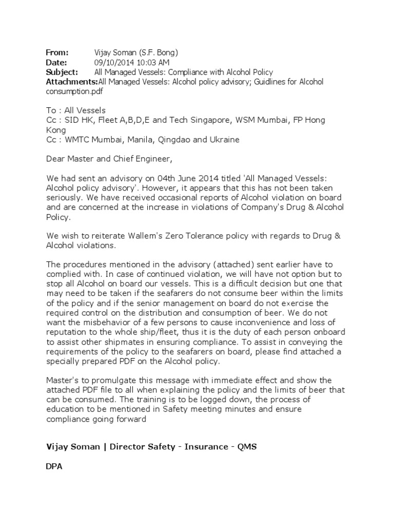 Drugs Alcohol Policy Our Polices Quality System Ocean Shipmanagement Ltd