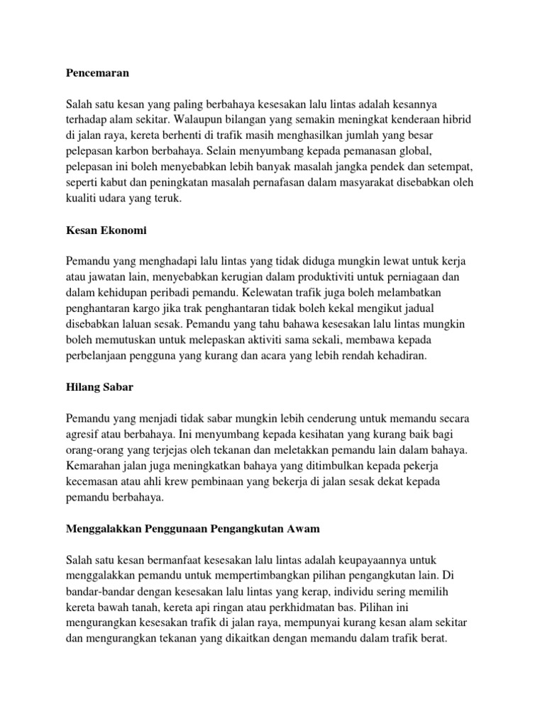 Dalam mengharungi arus globalisasi pada masa ini sistem pengangkutan awam di nusa kita makin hari makin maju. Scribd adalah situs bacaan dan penerbitan sosial terbesar di dunia. Kesesakan lalu lintas merupakan satu masalah yang belum dapat diatasi di kota. Huraikan sebab sebab berlakunya kesesakan lalu lintas yang berkaitan dengan sistem pengangkutan awam.
