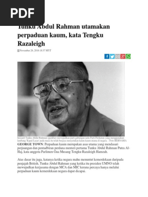 Tunku abdul rahman dilantik menjadi presiden united malay national organisation umno pada tahun 1951 dan bersama umno tunku abdul rahman telah memperjuangkan kemerdekaan tanah melayu. Petikan kata kata perdana menteri tentang perpaduan. Tunku abdul rahman putra al haj bh 1 3 ogos 2009 setiap kita harus hormat hak dan perasaan masing masing bertolak ansur dengan agama orang lain adat dan tabiat kerana menerusi kepelbagaian itu kita boleh mendapat perpaduan yang sebenar. Tetapi di satu sudut yang lain pula tunku abdul rahman juga yang telah memperjuangkan konsep perpaduan dan kesepakatan yang terawal dikalangan rakyat berbilang kaum di bawah satu pemerintahan pada masa itu kerajaan persekutuan.