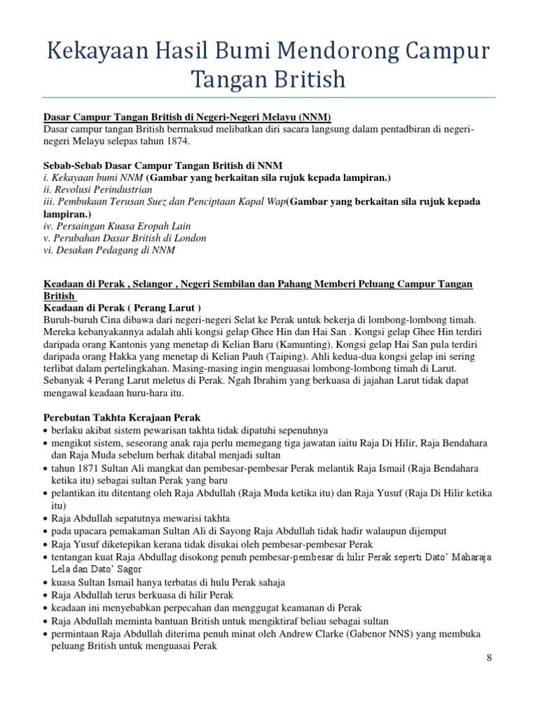 Kekayaan hasil bumi mendorong campur tangan british di perak. Kekayaan hasil bumi tanah melayu negeri negeri melayu kaya dgn. Sejarah tingkatan 2 bab 2 kekayaan hasil bumi mendorong campur tangan british sistem pewarisan takhta perak puan asmah othman smk. Telok datok depan tamat raja di hilir raja bendahara raja muda sultan klik tetikus untuk melihat perkembangan indek 4. Contohnya di perak british mengambil kesempatan ini akibat perebutan takhta kerajaan perak dan perbalahan antara kumpulan kongsi gelap cina.