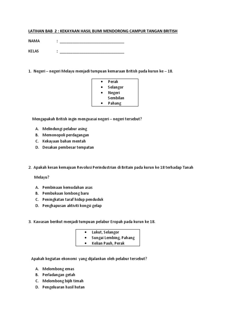 Hasil bumi seperti bijih timah emas bijih besi dan arang batu. Jawapan ms 29 2. Kawasan utama bijih timah di larut dan kinta perak di sungai pahang dan sungai lembing pahang di lukut kuala lumpur ampang dan petaling selangor dan di sungai ujong negeri sembilan. Faktor faktor campur tangan kekayaan hasil bumi revolusi perindustrian pembukaan terusan suez dan penciptaan kapal wap desakan pedagang nns bimbang campur tangan kuasa eropah lain pertukaran kerajaan mengubah dasar british 2.