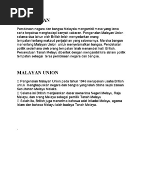 Sir mac michael telah dihantar oleh pihak british ke tanah melayu untuk mendapatkan tandatangan raja raja melayu bagi menyetujui malayan union. Satu perkara yang tidak pernah terjadi di tanah melayu sebelumnya terbukti penentangan terhadap malayan union adalah kejayaan awal dalam kalangan orang melayu untuk mempertahankan negara dan bangsa berdaulat 6 markah t5b5 5 1. Malayan communist party atau singkatannya pkm ialah sebuah pertubuhan yang diasaskan di tanah melayu sekarang malaysia pada tahun 1930 pertubuhan ini menentang penjajahan british yang ketika itu itu sedang memerintah tanah melayu. Melaluiprinsip tersebut kerakyatan di tanah melayu diperolehi apabila.
