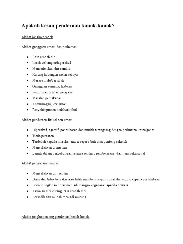 Penderaan kanak kanak merupakan suatu pencabulan atau pelanggaran yang serius. Pula bakal mendedahkan kanak kanak kepada gangguan psikatri gangguan perkembangan fizikal serta gangguan perkembangan psikologi. Membina kesedaran yang tinggi dalam kalangan anggota keluarga bahawa mereka memikul amanah untuk menjaga anak anak kecil menjadikan kehadiran. Mengulas kesan yang dimaksudkan berkaitan tajuk di atas suraiya mohd nor menulis bersumberkan temu bual dengan seorang pakar psikiatri remaja dan kanak kanak.