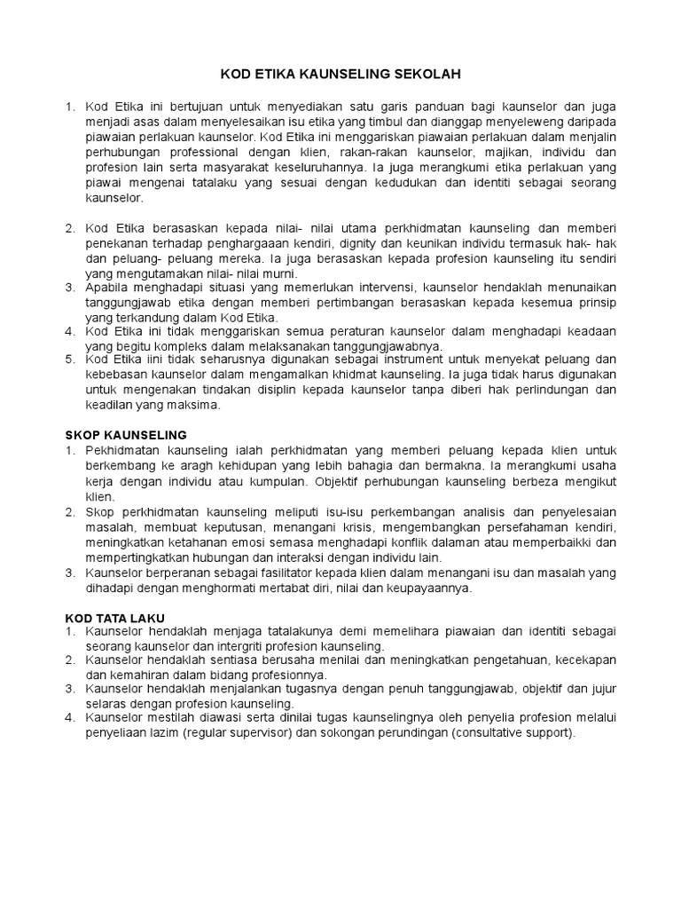 Kod etika kaunselor pdf. Kebiasaannya tempoh panggilan dilaksanakan lebih kurang 45 minit. Psikologi yang dilaksanakan oleh kaunselor berdaftar mengikut kod etika kaunseling untuk mencapai suatu perubahan kemajuan dan penyesuaian yang holistic baik dan sukarela pada diri klien supaya perubahan kemajuan dan penyesuaian itu akan berterusan sepanjang hayat klien akta kaunselor 1998 akta 580. Prakatasebagai seorang kaunselor profesional seseorang kaunselor berdaftar yangmengamalkan kaunseling bukan sahaja perlu menguasai ilmu dan kemahirankaunseling individu kelompok kaunseling perkahwinan dan keluarga memiliki ciri ciripersonaliti serta nilai nilai tertentu bahkan ia juga amat perlu. Kod etika profesional ini hendaklah terpakai kepada semua individu yang dibayar emolumen atau menerima imbuhan daripada utm apabila bekerja untuk universiti.