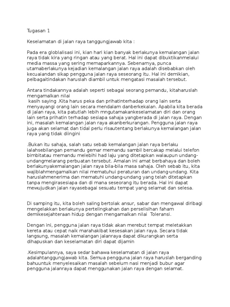 Langkah menangani kemalangan jalan raya moral folio. Ciri pemanduan dapat dipraktikkan dengan mengenakan topi keledar bagi penunggang motorsikal serta memandu mengikut had laju yang telah ditetapkan. Langkah terakhir dalam menangani isu yang kian membarah ini sudah tentulah melalui penganjuran kempen kempen kesedaran dalam hal yang berkaitan keselamatan jalan raya. Peraturan peraturan jalan raya seharusnyan dikaji semula dan ditambah baik bagi memastikan keselamatan pengguna sentiasa terpelihara. Langkah langkah menangani kemalangan jalan raya.