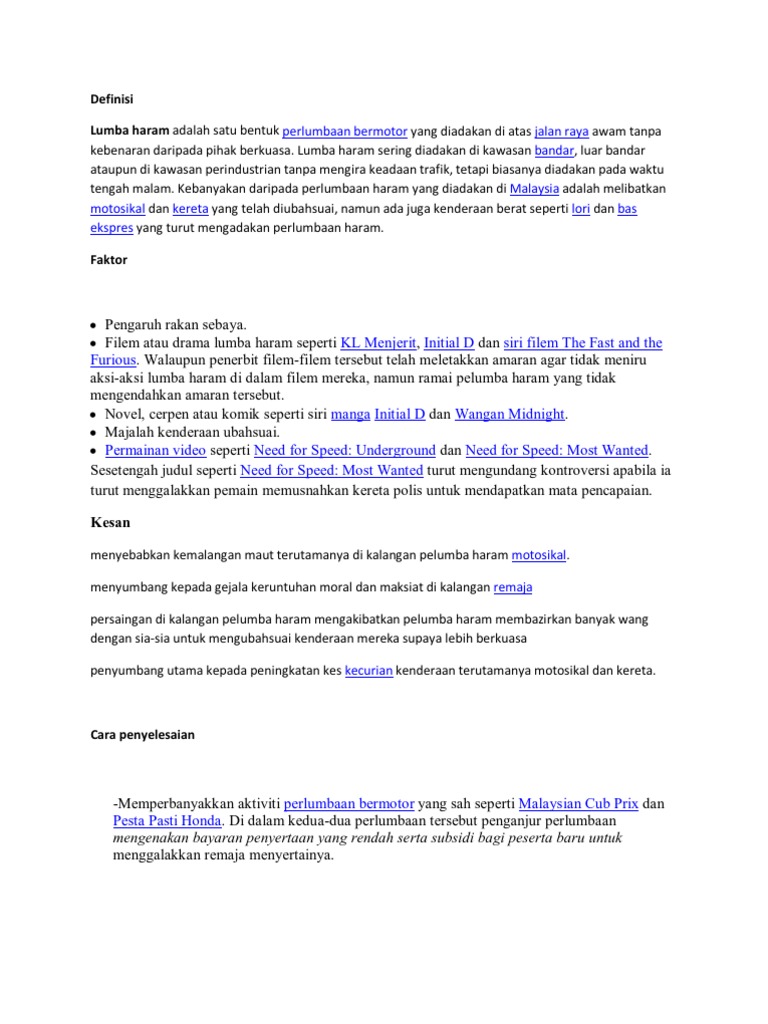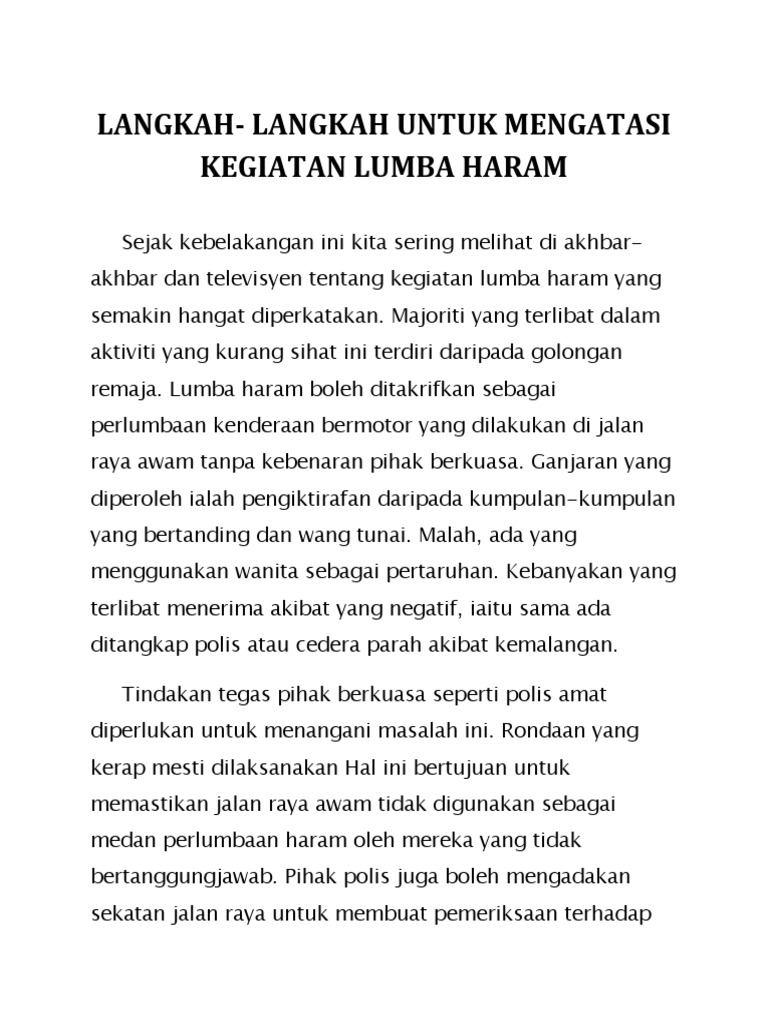 Langkah untuk mengatasi masalah lumba haram dalam kalangan remaja ialah ibu bapa perlu memberi perhatian yang secukupnya terhadap anak anak mereka. Antara langkah yang boleh diambil oleh institusi pendidikan bagi mengatasi masalah lumba haram adalah dengan mewujudkan subjek pendidikan sivik di sekolah bagi menerapkan nilai nilai murni dalam diri setiap pelajar. Oleh itu tidak hairanlah jika aktiviti lumba haram menjadi salah satu punca utama peningkatan kadar kemalangan jalan raya lumba haram turut menyumbang kepada gejala keruntuhan moral dan maksiat di kalangan remaja yang semakin serius kerana selain menyediakan hadiah wang yang sememangnya mempunyai kaitan dengan perjudian penganjur perlumbaan haram juga turut menyediakan hadiah bohsia untuk. August 23 2008 at 2 21 pm uncategorized penglibatan remaja dalam perlumbaan motosikal secara haram membimbangkan banyak pihak.
