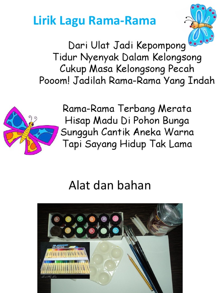 Dinyanyikan oleh pelajar pendidikan khas usm 2010 14. Lirik lagu rama rama ella seumpama rama rama terbang bebas di udara tanpa ada halangan aman damai suka suka riang ria tanpa ada rasa duka sengketa rama rama. Jadilah rama rama yang indah rama rama terbang merata sungguh cantik aneka warna hisap madu di pohon bunga tapi sayang hidup tak lama 2. Melihat kerenah melihat telatah manusia yang sering telagah ekspedisi ini bagai tiada henti kan menjadi antologi diri.