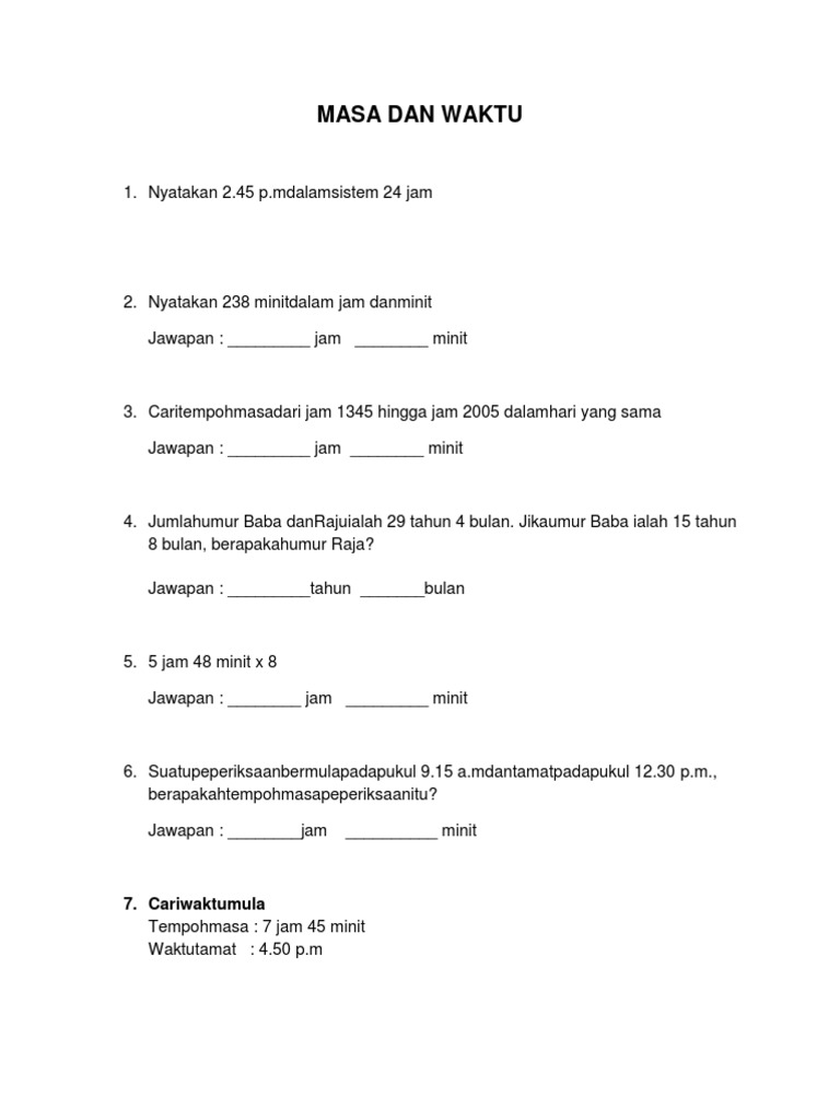 Masa dan waktu tahun 5 latihan. Waktu dan masa latihan matematik waktu dan masa id. Unit 16 koordinat unit 17 nisbah dan kadaran unit 18 pengurusan data. Masa dan waktu tahun 5 transcript. Soalan latihan topikal matematik upsr adalah latihan tambahan untuk pelajar pelajar lebih memahami bab bab utama dalam mata pelajaran matematik.