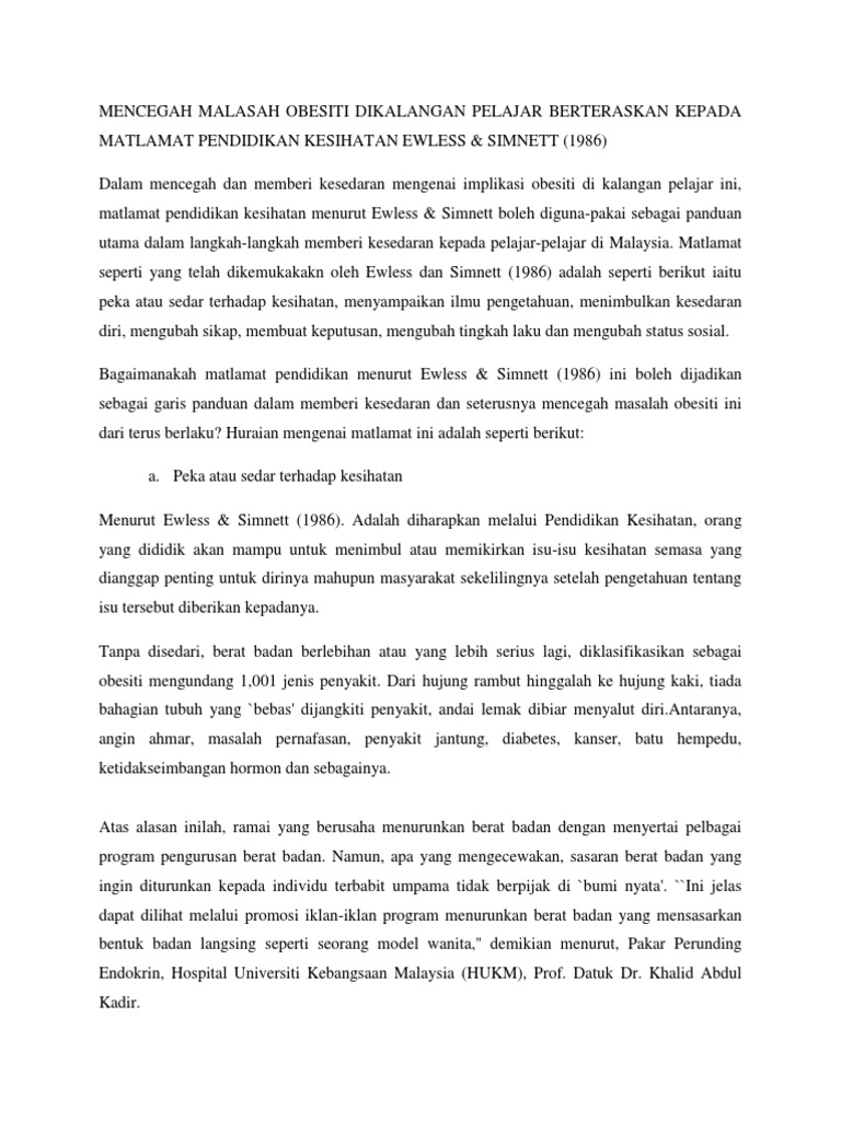 Masalah obesiti di malaysia karangan. Perkara ini seharusnya memberi kebimbangan kepada masyarakat umum terutamanya ibu dan bapa kerana golongan ini terdedah kepada risiko menghidapi masalah kesihatan penyakit kronik yang lain. Belakangan ini masalah obesiti semakin meningkat dalam kalangan rakyat negara kita. Mengikut laporan akbar peratusan rakyat malaysia yang mempunyai berat badan yang berlebihan ini adalah lebih tinggi berbanding dengan negara negara asia yang lain. Obesiti di malaysia telah meningkat dengan kadar yang tinggi iaitu 16 8 juta bersamaan dengan 60 daripada 28 juta penduduk.