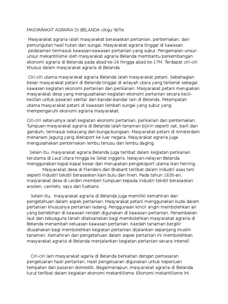 Perkembangan pesat dalam aktiviti pertanian dan penternakan menyebabkan muncul masyarakat agraria di belanda. Perkembangan ini dapat dilihat melalui penggunaan kaedah dan teknik pertanian yang lebih maju berbanding dengan negara negara eropah yang lain pengenalan pelbagai jenis tanaman baru dan turut menjadi pembekal produk tenusu ke negara negara lain. A pengenalan ekonomi negara belanda mula berlaku perkembangan terutama selepas belanda berjaya bebas daripada cengkaman kuasa sepanyol pada tahun 1585. Huraikan ciri ciri masyarakat agraria di belanda pengenalan.