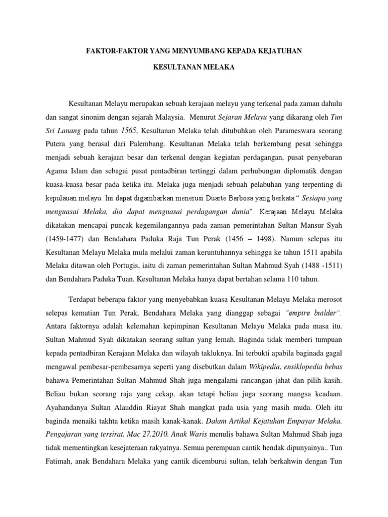 1 pengakhiran kesultanan melayu melaka melibatkan dua faktor iaitu a faktor dalaman dan faktor luaran b faktor dalaman dan faktor masalah kepimpinan c faktor luaran dan faktor serangan portugis d faktor dalam dan faktor masalah perpaduan 2 kedatangan portugis ke melaka mempunyai sebab sebab tertentu iaitu a ingin mengaut keuntungan dari melaka b kerana melaka kaya dengan rempah ratus c. Raihan bt ahmad dalam setiap kumpulan kami diberi tajuk dan diminta untuk menulis blog berkaitan tajuk tersebut t ajuk blog ini ialah kejatuhan kesultanan melayu melaka di tanah melayu.