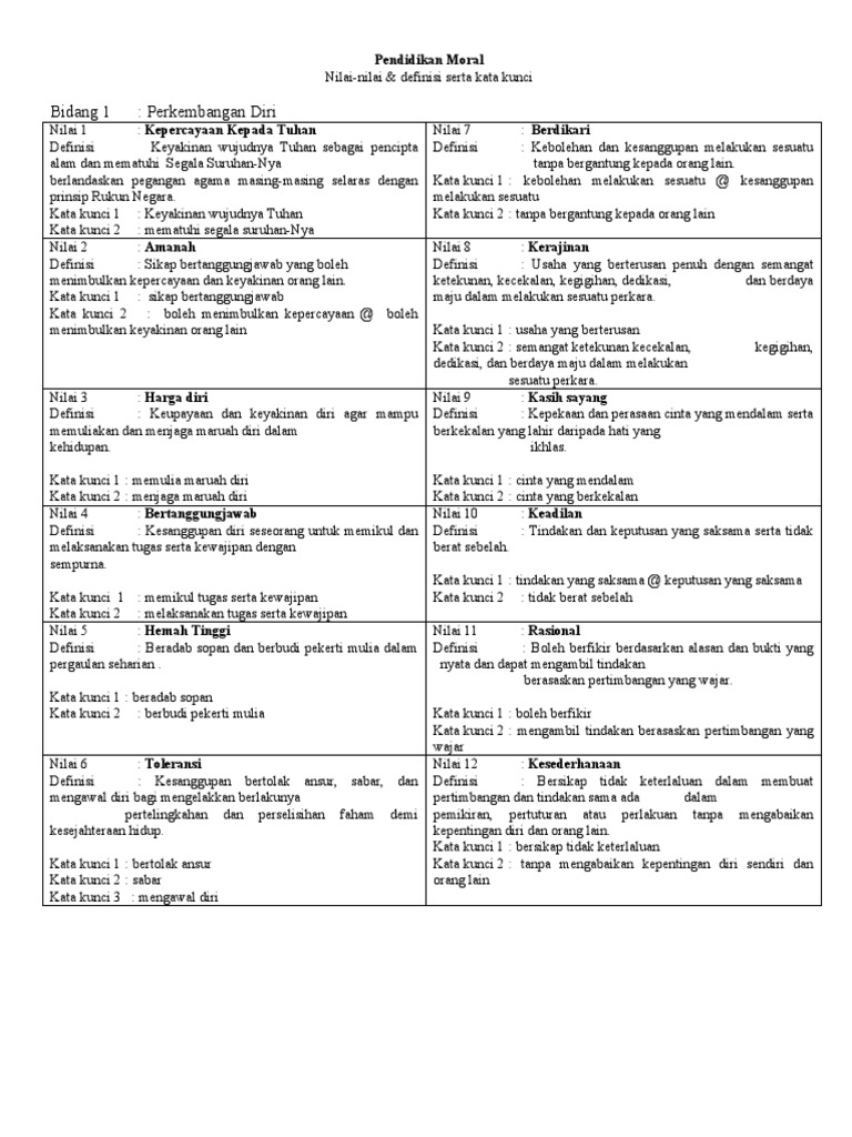 Nilai berkaitan dengan perkembangan dirikepercayaan kepada tuhandefinisi keyakinan wujudnya tuhan sebagai pencipta alam dan mematuhi segala suruhannyaberlandaskan pegangan agama masing masing selaras dengan prinsip rukun negara amanahdefinisi sikap bertanggungjawab yang boleh menimbulkan kepercayaan dan. Senarai nilai moral bidang 1 perkembangan diri 1 1 kepercayaan kepada tuhan keyakinan wujudnya tuhan sebagai pencipta alam dan mematuhi segala suruhan nya berlandaskan pegangan agama masing masing selaras dengan prinsip rukun negara 1 2 amanah sikap bertanggungjawab yang boleh menimbulkan kepercayaan dan keyakinan orang lain 1 3 harga diri. Nilai berperanan sebagai satu kriteria atau piawai standard yang konsisten agar individu atau masyarakat bertindak dengan baik betul dan boleh diterima. Pengertian nilai moral adalah.