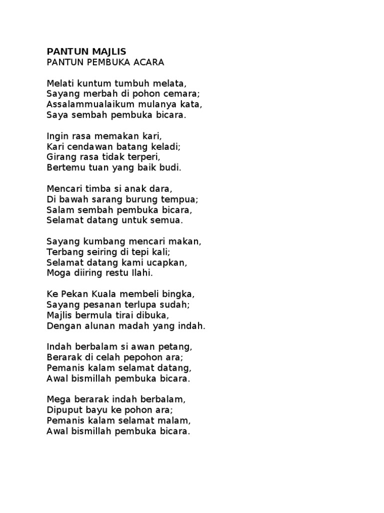 Menjadi kebanggaan untuk semua. Selamat datang kami ucapkan moga diiringi restu. Pantun majlis pantun pembuka acara melati kuntum tumbuh melata sayang merbah di pohon cemara. Tahniah atas kejayaan cemerlang.