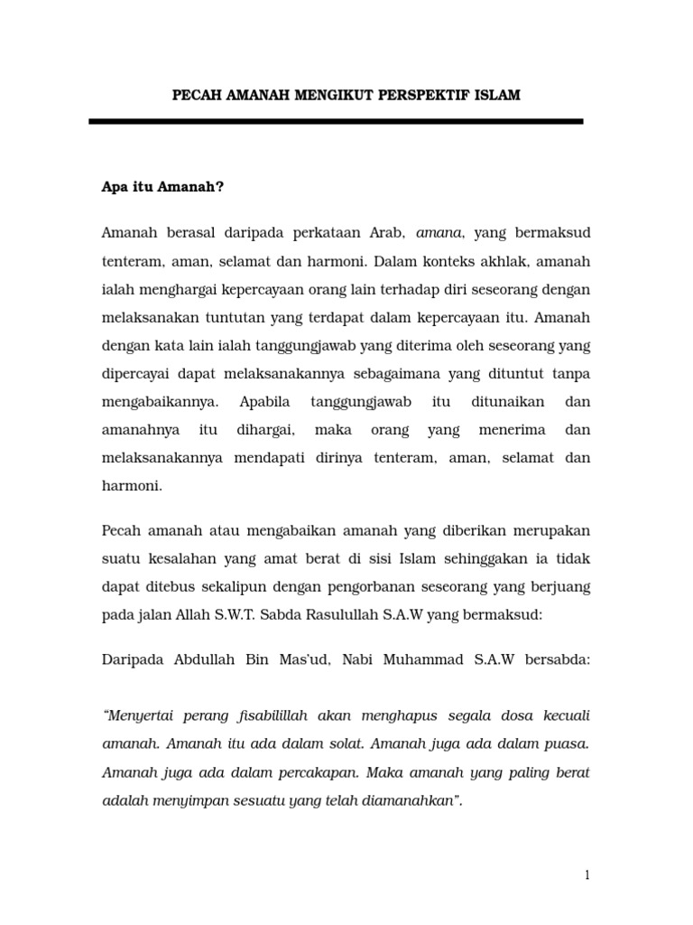 Bekas pengarah besar felda datuk faizoull ahmad dan bekas timbalan pengarah besar pengurusan sumber strategik felda muhammad sufi mahbub yang pernah disiasat oleh suruhanjaya pencegahan rasuah malaysia sprm pada 24 januari lalu didakwa di mahkamah seksyen kuala lumpur hari ini atas pertuduhan pecah amanah dan bersubahat melibatkan wang berjumlah kira kira rm 47 6 juta tiga tahun lalu. Sebagai seorang pekerja maka di bahu kita menggalas amanah untuk melaksanakan tugas dengan penuh minat ketekunan kegigihan dan kesungguhan yang tinggi. Laporan rasuah oleh transparency international pada 2005 melaporkan bahawa malaysia telah jatuh 16 tangga dalam tempoh 10 tahun ini dari tempat ke 23 pada tahun 1995 ke tempat 39 pada tahun 2004. Mereka yang bersuara untuk rakan rakan yang dibuli atau yang meniup wisel pada persekitaran.