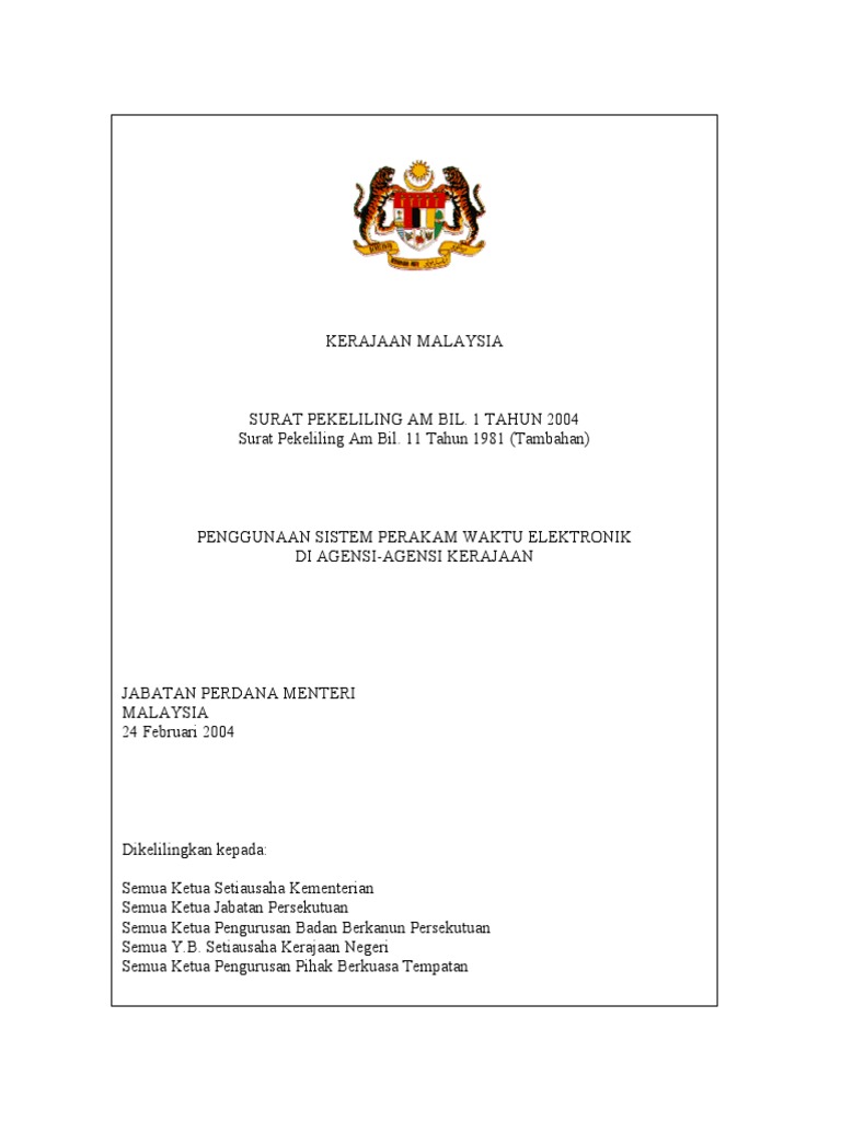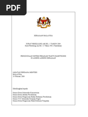 Surat pekeliling am bil. 1 tahun 2004 penggunaan sistem perakam waktu elektronik di agensi agensi kerajaan. Kad perakam waktu surat pekeliling am bil. Selaras dengan perkembangan teknologi masa kini sistem perakam waktu elektronik menawarkan alternatif yang lebih baik bagi merakam kehadiran dan pergerakan pegawai dan kakitangan di pejabat.