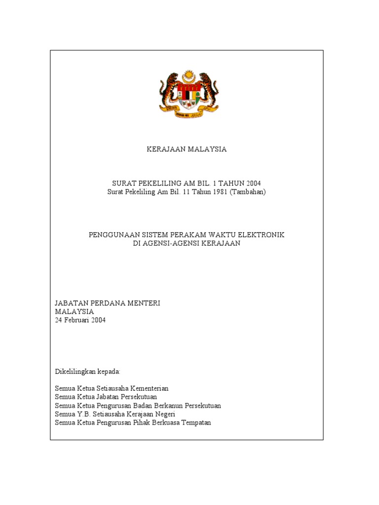 Surat pekeliling am bil. Agensi agensi kerajaan yang ingin menggunakan sistem perakam waktu elektronik hendaklah memastikan bahawa sistem perakam waktu elektronik yang dipilih mempunyai ciri ciri seperti yang dihuraikan di lampiran kepada surat pekeliling ini. Surat pekeliling am bil.