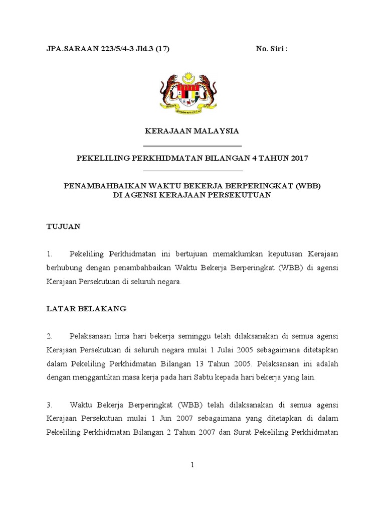 Portal rasmi jabatan perkhidmatan awam jpa. Selaras dengan transformasi perkhidmatan awam dan usaha penambahbaikan berterusan untuk mempertingkatkan sistem penyampaian perkhidmatan kepada orang. Penambahbaikan waktu bekerja berperingkat wbb di agensi kerajaan persekutuan. Pekeliling perkhidmatan bilangan 4 tahun 2017 subject.
