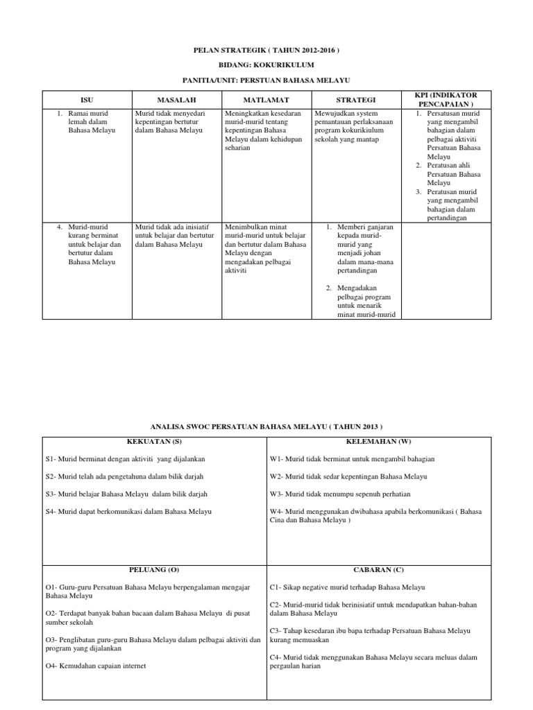 Pelan strategik bahasa melayu. S2 guru guru mencukupi terlatih dan guru berpengalaman melebihi 10 tahun. Pelan strategik panitia bahasa melayu tahun 2014 2016 nkra meluaskan akses kepada pendidikan berkualiti dan berkemampuan. Pelan strategik persatuan bahasa melayu 2016 2020. Perancangan strategik panitia bahasa malaysia smk bertam indah tahun 2008 2010 analisis swot dan tow matriks persekitaran dalaman persekitaran luaran strengths s kekuatan.